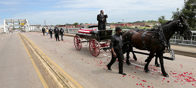 この歴史的な現場の雰囲気は、55年前と大差があった。当時は警察が、600人以上の黒人を残酷に殴ったことで、橋に赤い血痕が至るところについていたが、この日は、警察が敬礼をしながら敬意を表し、地面には赤いバラの花びらがまかれていた。市民は霊柩馬車が通るとき、「ありがとうございました」と叫んで、黒人の人権のために努力した故人の業績をたたえた。二頭の馬と黒い車体、赤褐色の車輪などは、マーティン・ルーサー・キング牧師の葬儀に使われた霊柩馬車のような形で設けられた。1986年に連邦下院議員として政界に本格入門したルイス元議員は、毎年この橋を訪れて「セルマ行進」を再現した。「血の日曜日」事件50周年だった2015年は、オバマ大統領(当時)と一緒に橋を歩いた。