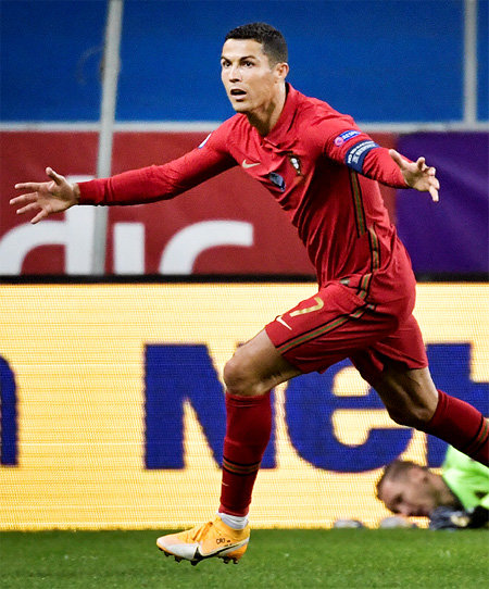 ロナウドは9日、スウエーデンのソルナで行われたスウエーデンとのUEFAネイションズリーグ・リーグAグループ3の第2節で2ゴールを決め、ポルトガルに2-0の勝利をもたらした。前半ロスタイム(47分)にFKで先制ゴールを決めたロナウドは、後半28分にゴールの隅に入る右足シュートでとどめを刺す得点を挙げた。