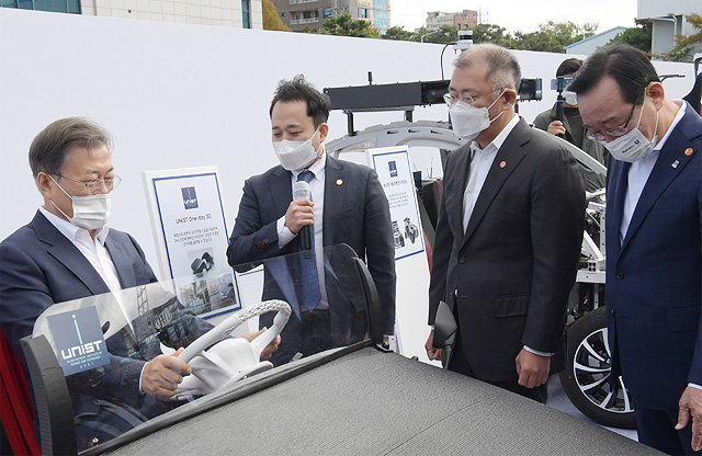 文大統領は同日、環境にやさしい未来車の開発現場である現代(ヒョンデ)自動車の蔚山(ウルサン)工場を訪問して、「世界的な激しい競争の中で、(今後)5年間が未来車市場をリードするゴールデンタイムになるだろう」と述べた。現代自蔚山工場は、世界初の水素自動車「ツーソン」と韓国初の量産型電気トラック「ポーター」などを生産した。現代自は同日、世界に先駆けて開発した「電気自動車専用プラットフォーム(E-GMP)」を公開した。
