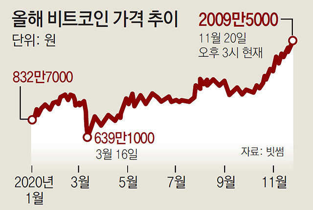 20日、韓国仮想通貨取引所・ビッサムによると、同日午後3時現在、ビットコインは2009万5000ウォンで取引された。これに先立って、18日に2000万ウォンを越えた後、乱高下を繰り返し、三日間2000万ウォン前後で取引を続けた。
