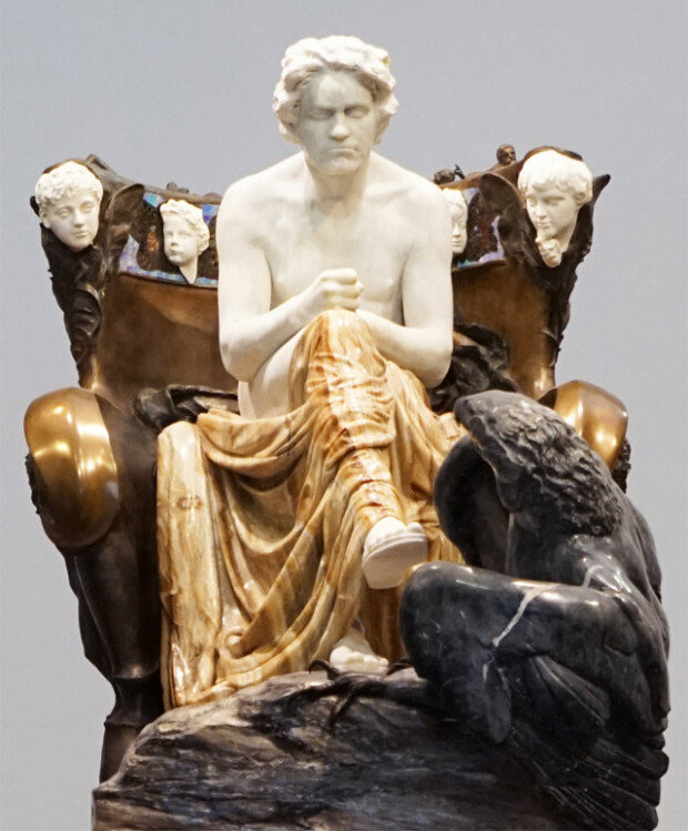 1857年、ライプツィヒで生まれたクリンガーは、パリ、ウィーン、ローマなどで活動し、画家や版画家として名を馳せた。故郷に帰った後、40歳からは実験的な彫刻に没頭した。クリンガーが展示に出した新作は、高さが3メートルを超える巨大なベートーベンの全身像だった。豊かな王座に裸でうずくまって座っているベートーベンは、英雄の姿ではなく軟弱な人間、いや幽霊のように見えた。ベートーベンの前に置かれた黒いワシやいすに刻まれた装飾は謎のようだった。彫刻に使われた色や材料も不慣れだった。単一色の青銅や大理石の彫刻ではなく、白、黄色、黒の大理石に象牙や青銅などの異質の材料を結合して作られた。