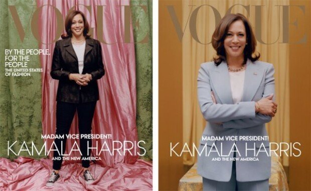 정치매체 더힐 등에 따르면 보그는 10일(현지 시간) 트위터를 통해 해리스 당선인이 모델로 등장한 2월호 표지 사진 2장을 공개했다. 첫 사진에서 그는 검은 바지 정장에 같은 색깔의 스니커즈를 신고 등장했다. 하지만 배경의 화려한 분홍 휘장이 오히려 모델을 가린다는 지적을 받고 있다.