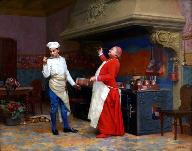 19世紀のフランスの画家ジャン・ジョルジュ・ヴィベールが描いた絵は、21世紀「料理放送」のワンシーンのようで面白味を与えるが、1つ疑問がある。法王に仕える最高位聖職者がなぜ台所で料理をしているのか。今でこそ料理する男はありふれているが、19世紀なら話は違う。特に、上流層の男性や高位聖職者が台所に入ることは想像できない時代だった。ところでこの枢機卿は、鮮やかな赤い服の上にエプロンをつけ、料理の腕を披露している。