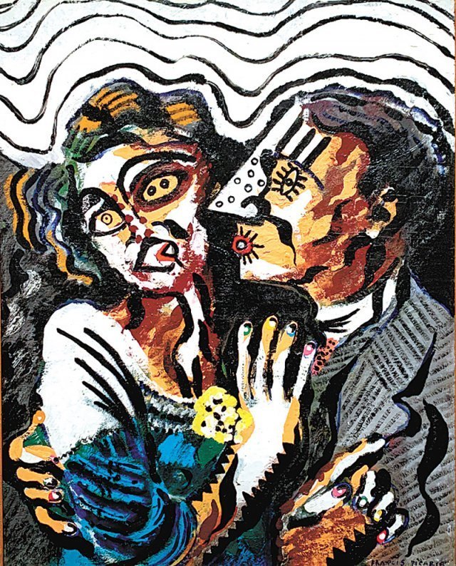 パリ生まれのピカビアは、美術大学を卒業後、最初は印象主義の絵を描いた。1909年から、当時前衛芸術として浮上したキュビスムに熱中し、抽象画家に転じたが、マルセル・デュシャンに会ってからは、ダダイスムの中心メンバーになった。1921年以降は超現実主義に関心を向け、機械時代を代弁するコラージュ作業に没頭した。そして1925年に再び具象絵画に戻り、「怪物たち」の連作を製作したが、この肖像画もこれに属する。絵の中の恋人は、怪奇でありながらも滑稽な姿で描かれている。グレーのスーツを着た男が、女を抱きかかかえて無理やりキスしようとすると、女が(断るように)手で押している。驚いた姿を強調するためか、女性の左目は瞳が2つもある。男性の鼻は異常に大きく、目も縦になっている。タイトルを見ると、2人は初めて会った間柄だ。会うや否や突きつける男だなんて! 女が戸惑うのも当然だ。