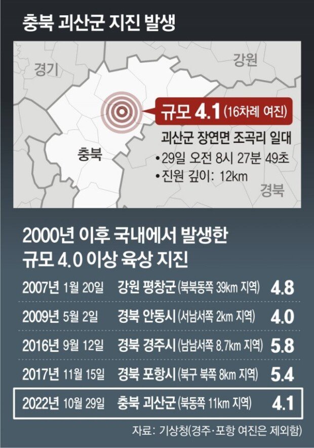 29일 충북 괴산군에서 규모 4.1의 지진이 발생했다. 2016년 경주(규모 5.8), 2017년 포항(5.4) 지진 이후 육상 지진으로는 가장 센 지진이다. 다행히 큰 피해는 발생하지 않았지만 30일에도 10여 차례 여진이 이어졌다.