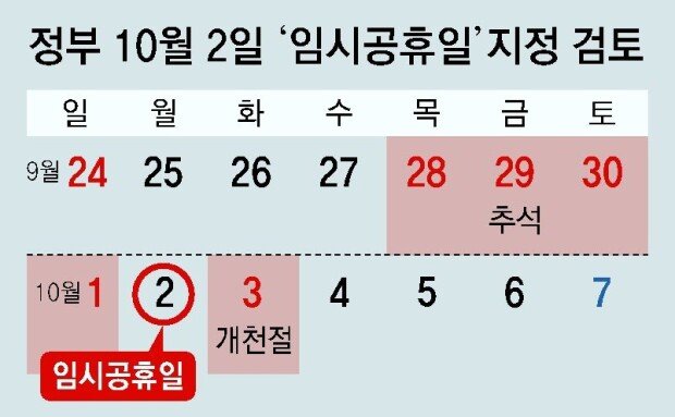 政府が、今年の秋夕(チュソク=旧暦8月15日)の連休(9月28日~10月1日)と開天節(ケチョンジョル=10月3日)の間に挟まれた10月2日を臨時公休日に指定する案を検討している。10月2日が臨時公休日に指定されれば、6日間の「大型連休」が可能になる。