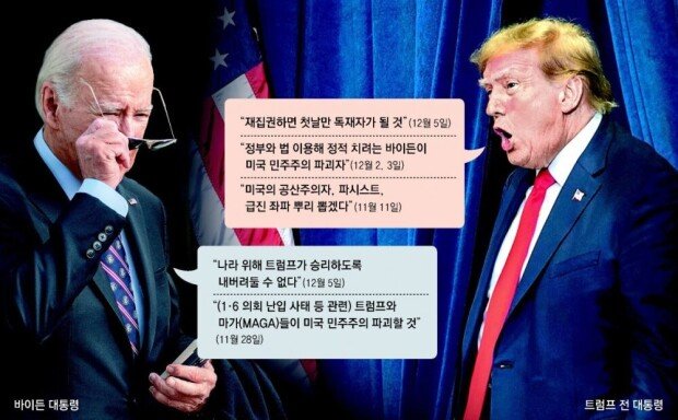 그는 2, 3일 양일간 지지층에게 “바이든은 미 민주주의의 파괴자”라고도 외쳤다. 바이든 대통령이 최근 자신을 비판하며 쓴 표현을 그대로 사용했다. 트럼프 전 대통령은 “바이든은 정부와 법을 무기로 이용해서 정적(政敵)을 치려고 한다”며 올들어 자신을 상대로 이뤄진 4건의 형사 기소가 그 증거라고 주장했다. 지난달에는 “재선되면 해충처럼 미국에 살고 있는 공산주의자, 마르크스주의자, 파시스트, 급진 좌파들을 뿌리 뽑을 것”이라고도 했다.