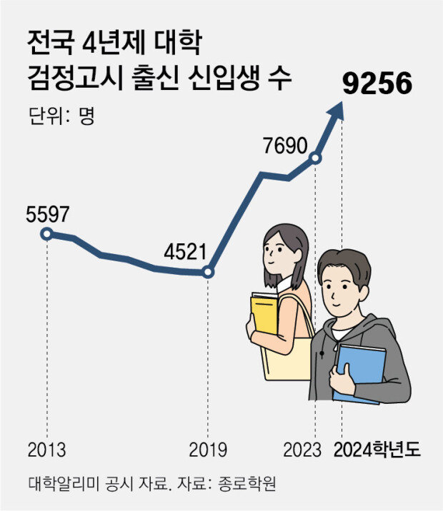 3日、鐘路(チョンノ)学院が大学アリミで、2024学年度の全国4年制大学222校の新入生のうち、高卒認定試験の合格生を分析した結果9256人で、前年(7690人)より20.4%増加したことが分かった。この数値は、2013学年度(5597人)から公示されたが、今年が過去最高だった。最も数値の少なかった2019学年度(4521人)と比べると、2倍を超える。