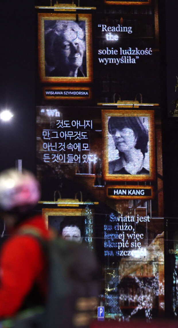 7日(現地時間)午後、スウェーデンのストックホルム市庁舎の外壁に小説家、韓江(ハン・ガン)氏の写真とともに、韓氏の作品『すべての、白いものたちの』の一節がハングルと英語で浮かび上がった。ノーベルウィークを迎え、韓氏をはじめとする歴代女性受賞者を収めた映像がレーザー照明(メディアファサード)で投影された。