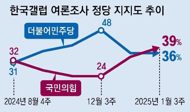 与党「国民の力」の支持率が39%を示し、最大野党「共に民主党」(36%)より3ポイント高い世論調査結果が17日、発表された。12・3非常戒厳宣言以降に24ポイントまで開いた与党と民主党との支持率の差が誤差の範囲内で逆転したのだ。与党の支持率が民主党を上回ったのは5ヵ月ぶりのこと。