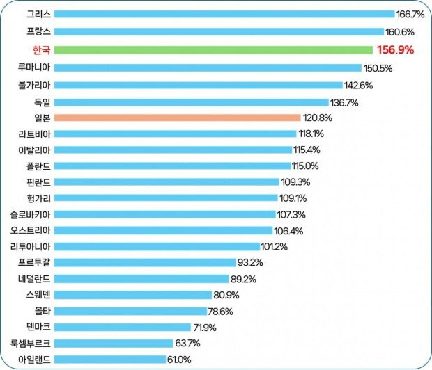 1인당 국내총생산(GDP) 대비 대기업 임금 수준도 한국이 156.9%로 EU 평균(134.7%), 일본(120.8%)보다 높았다. 그리스(166.7%)와 프랑스(160.6%)에 이어 3번째로 높은 수준이다.