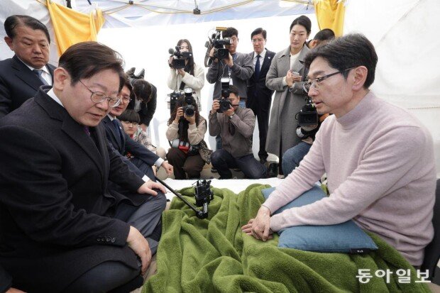 이 대표는 이날 윤석열 대통령 탄핵 심판 선고를 촉구하며 13일 째 단식 중인 김경수 전 경남지사를 찾아 단식 중단을 권유했다. 윤 대통령 탄핵 심판 선고가 지연되자 내부 결속에 나섰다는 해석도 나온다.