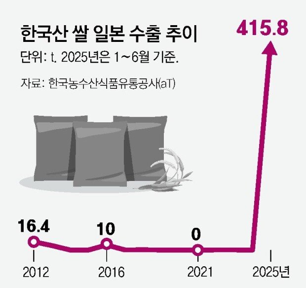 4일 일본 니혼게이자이(닛케이)신문이 한국농수산식품유통공사(aT)를 인용해 이같이 보도하며 “1990년 관련 통계가 집계된 이후 한국 쌀의 대일 수출량이 가장 많았던 것은 2012년의 16.4t으로 당시 동일본 대지진 구호물자로 주로 들어왔다”고 전했다. 이어 “올해 상반기 한국 쌀의 일본 수출량은 앞서 가장 많았던 2012년 연간 규모보다 26배 증가한 것”이라고 했다. 일본의 쌀값 폭등세는 꺾였지만 가을 햅쌀이 고가에 형성되며 가격 불안정성이 커지는 상황이다. 이에 하반기(7∼12월)에도 한국 쌀의 일본 수출이 늘어날 수 있다는 전망도 나온다.