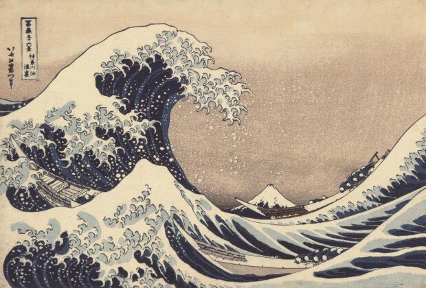 すべてを飲み込むかのような激しい波。危うく揺れる船の上では船員たちが身を伏せている。水しぶきは空を覆い尽くすが、遠くには富士山が堂々と立ち、動揺する気配すらない。よく見ると、波も富士山に似ている。