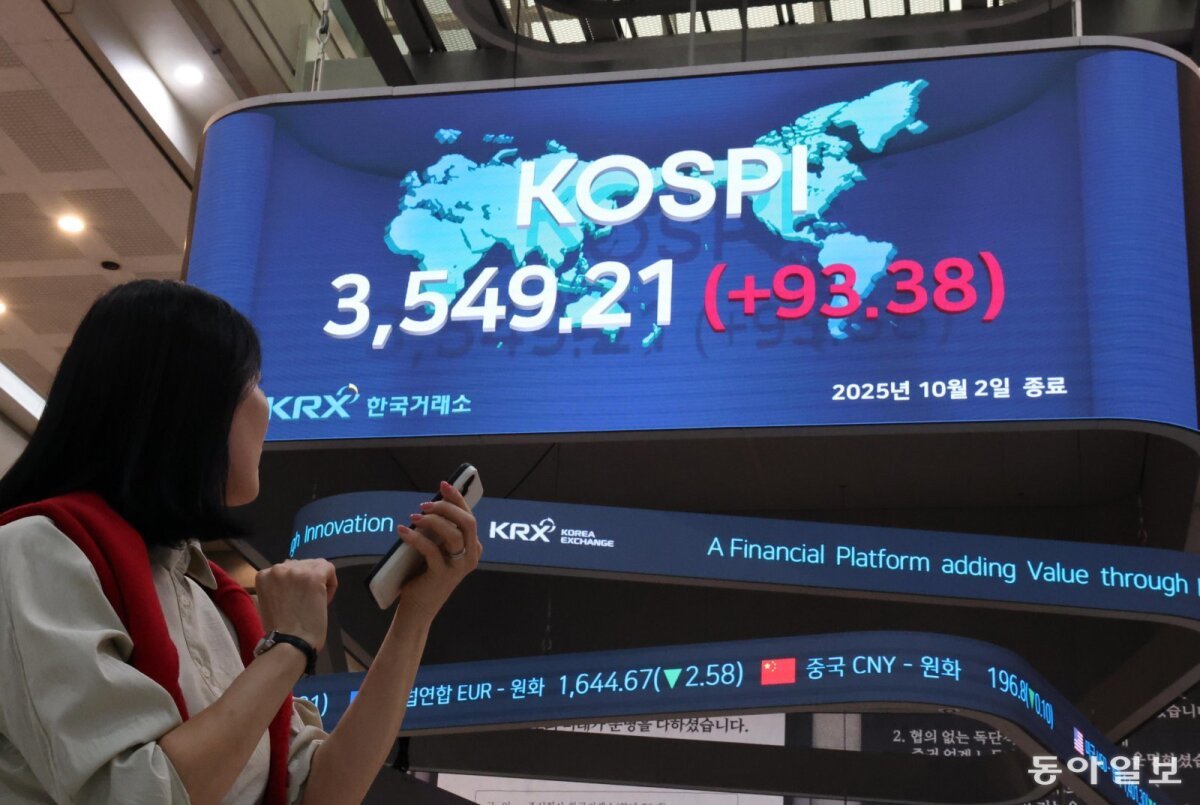 総合株価指数(コスピ)が、秋夕(チュソク=陰暦8月15日の節句)連休を前に2日、史上初めて3500台を突破し、新たな節目を刻んだ。三星(サムスン)やSK、オープンAIの人工知能(AI)半導体のいわゆる「3角同盟」株に外国人投資家の資金が集中し、三星電子とSKハイニックスはそれぞれ取引時間中に三星電子は9万ウォンをSKハイニックスは40万ウォンをタッチした。金産分離緩和のシグナルを受け、主要持株会社も一時的に上昇した。
