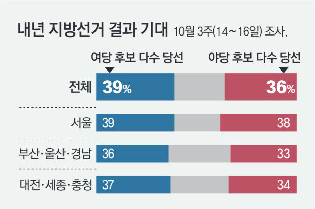 내년 6·3 지방선거에 대해 여당 후보가 다수 당선되길 기대하는 응답자가 39%, 야당 후보가 다수 당선되길 기대하는 응답자가 36%로 오차 범위(±3.1%포인트) 내 접전인 조사 결과가 나왔다. 여야가 승부처로 꼽는 서울과 부울경(부산·울산·경남)도 접전 양상이었다. 이재명 대통령의 국정 지지율은 정부 출범 이후 최저치인 54%를 기록했다. 10·15 부동산 대책과 대미 관세 협상 지연 등이 영향을 미친 것으로 풀이된다.