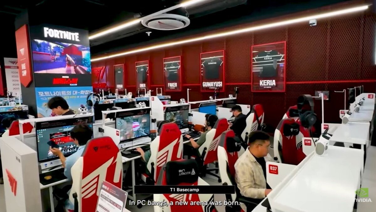 さらに「そして一つの火花が生まれた。それは『スタークラフト』だった」とし、1990年代のPCバン(ネットカフェ)のブームをきっかけにeスポーツ大国となった韓国を紹介。「PCバンという新しい競技場が誕生し、NVIDIAの『GeForce(ジーフォース)』は新世代プレーヤーの機器となった」と続けた。ジーフォースとは、1999年に発売されたNVIDIAのGPUシリーズだ。