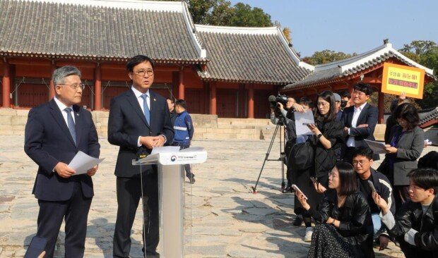 최 장관은 7일 오후 허민 국가유산청장과 함께 종묘 정전을 찾아 “종묘는 조선 왕실의 위패가 모셔진 신성한 유산이자 우리나라 유네스코 세계유산 1호의 상징적 가치를 지닌 곳”이라며 “이러한 가치가 훼손될 수 있는 현 상황이 매우 우려스럽다”고 밝혔다. 최 장관은 이어 “모든 수단을 강구해 우리 문화유산을 지키는 일에 앞장서겠다”며 “문화유산법, 세계유산법 등 관련 법령을 개정하고, 필요한 경우 새 법령 제정도 추진하겠다”고 밝혔다.