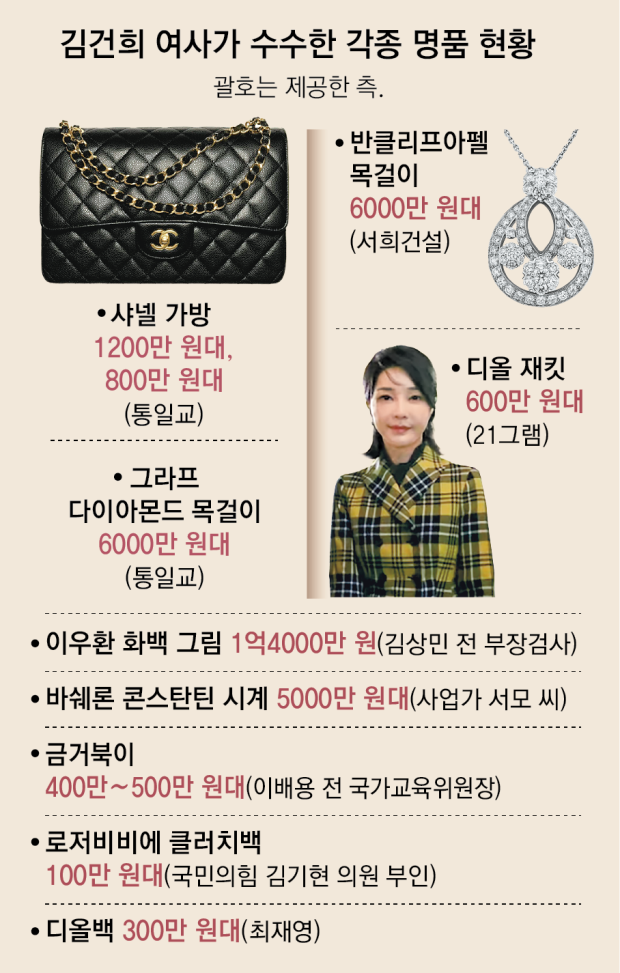 그동안 특검이 수사를 진행하며 발견한 명품만 현재까지 총 10여 점에 가액만 4억 원대를 넘어선 것으로 나타났다. 특검은 각종 명품 수수 과정에서 현안 및 인사 청탁을 들어준 대가로 김 여사가 받은 것으로 보고 윤석열 전 대통령과의 공모 가능성 등을 입증해 나갈 방침이다. 이를 위해 특검은 윤 전 대통령에게 26일 피의자 신분으로 나와 조사받으라고 통보했다.