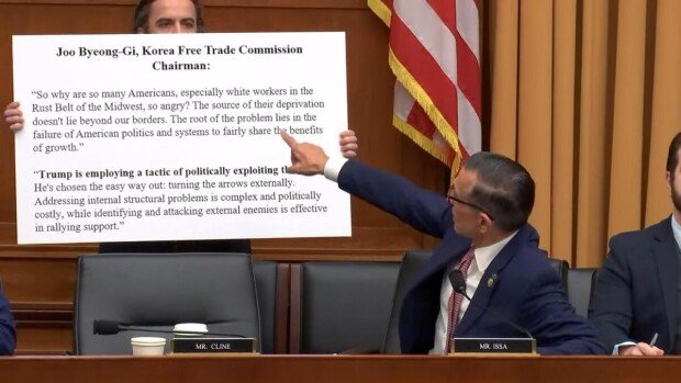 특히 아이사 의원은 주 위원장이 서울대 교수 겸 공정위 위원장 후보자 시절이었던 올 8월 한 매체에 기고한 ‘한미 동맹은 미국산 서비스 상품이 아니다’라는 칼럼의 주요 내용을 영어로 번역한 대형 피켓을 들고 나와 비판했다. 이 피켓에는 주 위원장이 ‘미국 백인 노동자들이 느끼는 분노의 원인은 정치 실패 때문이며, 도널드 트럼프 대통령이 이 분노를 정치적으로 이용하고 있다’고 기술한 부분이 적혀 있었다.