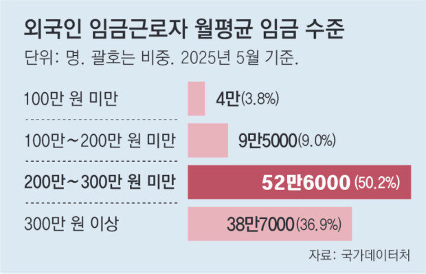 외국인 취업자의 94.4%(104만7000명)는 임금근로자였다. 전년 대비 9만1000명 증가했다. 하지만 절반 이상의 월평균 임금 수준이 300만 원에 미치지 못했다. 200만∼300만 원 미만인 경우(52만6000명)가 50.2%로 가장 많았고 300만 원 이상을 받는 경우(38만7000명)는 36.9%를 차지했다.