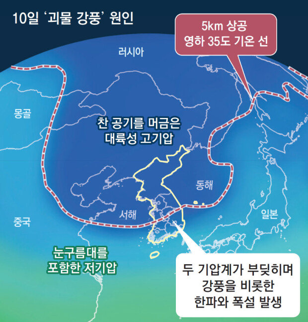 気象庁によると、10日午後11時36分ごろ、済州市翰京面高山里(チェジュシ・ハンギョンミョン・コサンリ)では、瞬間風速が時速112.3キロを記録した。江原道高城郡(カンウォンド・コソングン)では同日午後、瞬間風速が時速95.8キロに達し、束草(ソクチョシ)市でも時速95キロを観測した。北西から南下した強い寒気が、降雪・降雨を伴う低気圧と激しく衝突し、台風級の強風を生み出した。