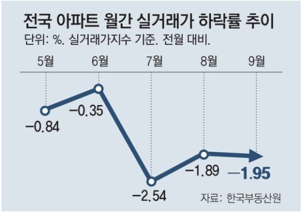 주택 매물이 쌓이고 하락 거래가 이어지면서 올해 9월 전국 아파트 실거래가지수가 역대 가장 큰 폭으로 떨어졌다. 정부가 규제 지역을 잇달아 해제하고 대출 규제 완화 방안을 발표했지만 매수 심리가 얼어붙으면서 거래 절벽이 이어지고 있다.