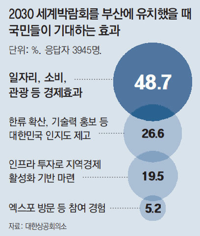 20일 대한상공회의소는 국내 거주 국민 3945명을 대상으로 세계박람회 부산 유치에 대해 조사한 결과 응답자의 48.7%가 일자리, 소비, 관광 등 경제효과를 가장 기대한다고 답했다고 밝혔다. 대한상의는 소통플랫폼을 통해 3일부터 16일까지 세계박람회 부산 유치에 대한 의견을 물었다. 응답자들은 경제효과에 이어 한류 확산, 기술력 홍보 등 대한민국 인지도 제고(26.6%), 인프라 투자로 지역경제 활성화 기반 마련(19.5%), 엑스포 방문 등 참여경험(5.2%) 등의 효과가 기대된다고 답했다.