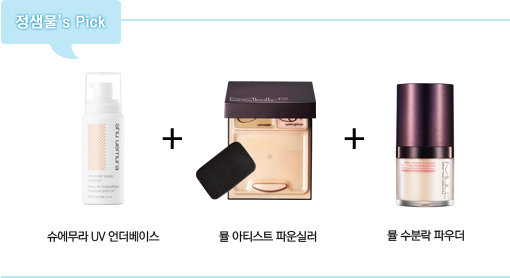 “피부에 닿으면 쿨링감이 느껴지는 ‘슈에무라 UV 언더베이스’를 스펀지로 꼼꼼히 바른 후, 파운데이션과 컨실러가 결합된 ‘뮬 아티스트 파운실러’를 바른다. 이 때 밀착력을 높이기 위해 브러시로 피부를 다지듯 톡톡 두드려주면 좀 더 오래가는 메이크업이 완성된다. 마지막으로 수분에 강한 ‘뮬 수분락 파우더’를 가볍게 바른다.” 정샘물 인스피레이션 ‘정샘물 원장’은… 스타 메이크업의 대명사이자 트레이드 마크인 투명 메이크업으로 유명한 정샘물 원장은 이효리, 보아, 이미연, 김태희 등 국내 최정상급 스타들의 메이크업을 담당하고 있다. 메이크업에 대한 노하우와 셀프 뷰티케어를 담은 ‘정샘물의 시크릿 뷰티’를 출간하고, 메이크업 브랜드 ‘뮬’을 론칭하는 등 뷰티 업계 최고의 전문가로 활약하고 있다.