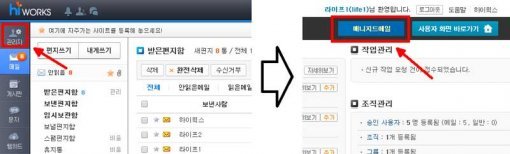 매니지드 메일 메뉴를 이용하려면 우선 해당 사용자가 관리자의 권한을 가지고 있어야 한다. 하이웍스 관리 콘솔에 접속, ‘관리자’ 메뉴로 들어가 우측 상단의 ‘매니지드메일’을 클릭하자. 매니지드메일 메뉴에서 쓸 수 있는 대표적인 기능은 다음과 같다.