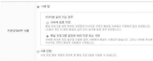 해당 메뉴에서 POP3 / SMTP를 ‘사용함’으로 설정해야 외부 메일 소프트웨어에서 하이웍스 기반 메일을 주고받을 수 있다. 또한 외부 메일 소프트웨어에서 메일을 주고받을 때 서버에도 해당 메일을 남겨둘지, 혹은 삭제할 지의 설정도 가능하다.
