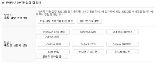 참고로 외부 메일 소프트웨어에서 POP3 / SMTP 관련 설정을 하는데 익숙하지 않은 초보자를 위해 이 메뉴에는 각 상황(아웃룩, 맥, iOS, 안드로이드 등)에서 어떻게 설정을 하는지를 설명해주는 항목이 있으며, 아예 자동 설정을 해주는 프로그램도 제공하고 있다.