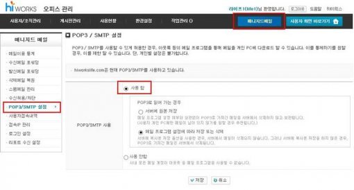 참고로 이 설정에는 외부 메일(POP3) 이용 시 메일의 저장 방법을 정하는 하위 옵션이 있다. 만약 하이웍스 관리콘솔에서도 메일을 자주 확인한다면 ‘서버에 원본저장’으로 설정하자. 이렇게 하면 외부 메일 소프트웨어에서 가져간 메일이 삭제되지 않고 서버에 남아있으므로 외부 소프트웨어에서 메일을 수신하더라도 나중에 하이웍스 관리콘솔을 통해 메일을 재확인할 수 있다.