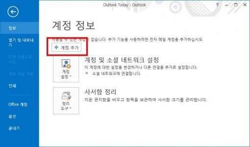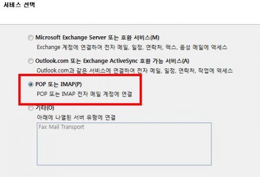 아웃룩 2013에서는 이 단계에서 다양한 선택기가 등장한다. ‘POP 또는 IMAP’을 선택, 다음으로 진행, 계정 추가를 한다.