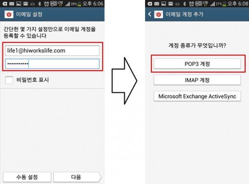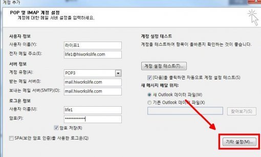 계정추가 메뉴에서는 사용자 이름 및 메일 주소, 서버 정보 등을 바르게 입력해야 한다. 만약 life1@hiworkslife.com라는 메일 계정을 가진 ‘라이프1’이라는 사용자라면 사용자 이름과 전자 메일 주소를 그대로 입력하고 서버 유형은 POP3로 지정하자, 받는 메일 서버와 보내는 메일 서버는 각각 mail.회사계정(hiworkslife.com 등)로 입력하면 된다.