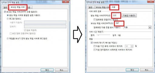 그 후 사용자의 로그온 정보(ID와 비밀번호)를 입력한 뒤 ‘기타 설정’을 클릭해 인터넷 전자 메일 설정을 띄우자. 이곳에는 3개의 탭이 있는데 일단은 ‘보내는 메일 서버’를 선택한다. 여기서 ‘받는 메일 서버와 동일한 설정 사용’에 꼭 체크를 해야 한다.