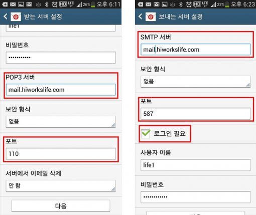 이제부터는 메일을 받는 서버와 보내는 서버의 설정을 할 차례다. 이곳에서는 POP3 서버 항목과 SMTP 서버 항목은 모두 mail.회사계정(hiworkslife.com 등)으로 설정하며, 포트 번호는 받는 서버는 110, 보내는 서버는 587로 설정한다, ‘로그인 필요’ 역시 체크해 두어야 한다.