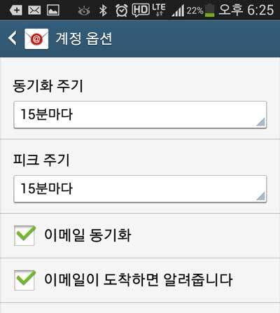 다음은 이메일 계정의 동기화 및 피크 주기의 설정이다. 동기화는 스마트폰과 가비아 서버간의 메일 수신 상태를 동일하게 만드는 것, 피크는 정해진 시간마다 새로운 이메일의 수신 여부를 확인하는 기능이다. 초기값은 15분이지만, 사용자의 취향에 따라 시간을 달리 하는 것도 가능하다.