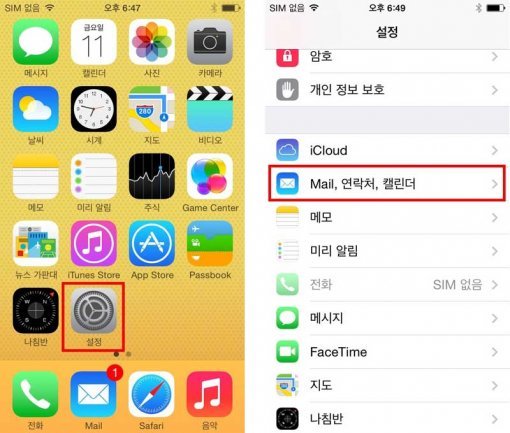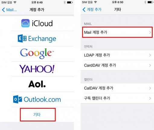 ‘설정’으로 들어가 ‘Mail, 연락처, 캘린더’, ‘계정추가’ 순으로 선택한 후 메일 종류에서 ‘기타’와 ‘Mail 계정 추가’를 차례로 선택하자.