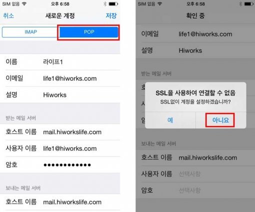 새로운 계정 메뉴가 나오니 여기서 사용자의 이름 및 이메일, 암호 및 설명을 그대로 입력해주면 된다. 그리고 ‘다음’을 눌러 서버 설정을 한다. 상단의 계정 유형이 IMAP이 아닌 POP으로 되어있는지를 확인한 후 받는 메일 서버 및 보내는 메일 서버의 호스트 이름을 mail.회사계정(hiworkslife.com 등)으로 입력해 주자. 그 후 ‘저장’을 누르면 나오는 SSL 미사용 여부는 ‘아니오’를 선택한다.
