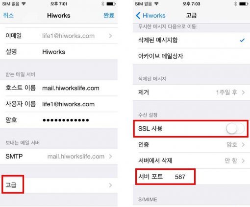 이곳에서 SSL 사용은 비활성화 되었는지, 그리고 서버 포트는 587로 되어있는지를 확인하고, 그렇지 않다면 수정한다. 이러한 과정을 거친 뒤 ‘완료’를 누르면 해당 아이폰에서 가비아 메일을 이용할 수 있게 된다.
