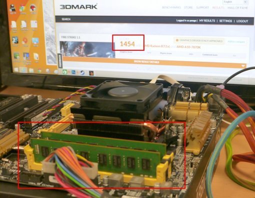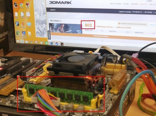 마침 제가 AMD APU(A10-7870K 고다바리) 기반의 PC를 이용해 성능 테스트를 해봤습니다. 3D 그래픽 성능을 테스트해서 이를 점수로 매기는 3DMark(Fire Strike 모드)라는 프로그램을 구동해보니, 8GB 메모리(PC3-12800) 1개를 꽂았을 때는 803점, 4GB 메모리(PC3-12800) 2개를 꽂았을 때는 1454점이 나왔습니다. 상당히 큰 차이죠? 이 정도 성능의 내장 그래픽에 듀얼채널 메모리를 결합하면 10 만원 대 이하의 어지간한 보급형 그래픽카드를 꽂는 것보다 나은 성능을 기대할 수 있습니다.