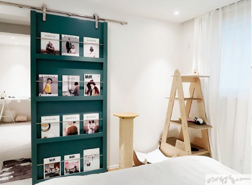 1 안방 문은 노출형 슬라이딩 도어로 책을 꽂을 수 있게 제작했다. 문 옆에는 루벤 캣타워와 해먹을 놓았는데 환한 컬러의 원목 제품을 선택해 화이트풍 집과 조화를 이루도록 했다.