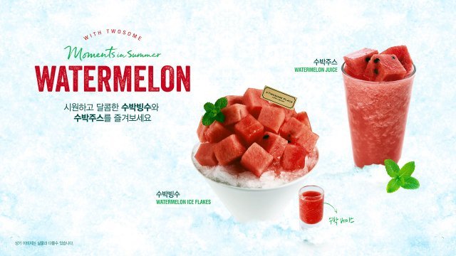 투썸플레이스 수박 빙수는 곱게 갈은 얼음 위에 수박을 가득 올리고 얼음 속에는 달콤한 딸기를 더해 두 가지 과일 맛을 동시에 즐길 수 있는 제품이다. 수박 주스는 수박을 듬뿍 넣어 갈아 만든 주스에 큼직한 사각 형태 수박을 올려 신선함을 강조했다.