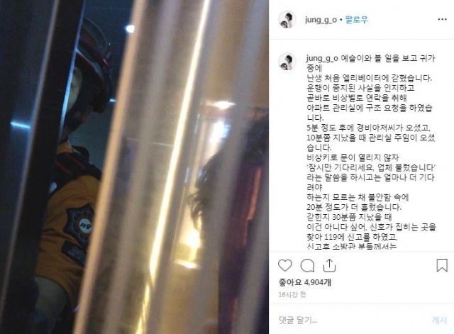 이어 "갇힌지 30분쯤 지났을 때 이건 아니다 싶어, 신호가 집히는 곳을 찾아 119에 신고 했다"며 "7분만에 소방관 네 분이 도착하셨고 도착 후 1분도 채 지나지 않아 엘리베이터 문을 열어주셨다"고 밝혔다.