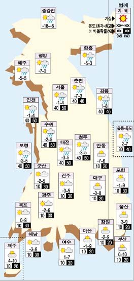 전국이 맑은 후 밤부터 차차 구름 많이 끼겠다. 아침 최저기온은 영하7도∼영상4도. 낮최고 2∼10도. 바다의 물결은 1.5∼2.0m.