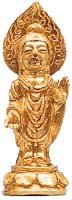 초소형이면서도 온화한 미소가 돋보이는 이 금동불상은 얼굴(상호·相好) 뒤편 두광(頭光)에 새겨진 불꽃문양(화염문·火焰文)이 특히 정교하다. 1천3백여년전 신라인의 불심(佛心)과 섬세하고 탁월한 금속공예술을 잘 보여주는 걸작. 발견 당시 순금제 불상으로 알려졌으나 X선 분석기를 이용한 비파괴 검사 결과 금 동 수은 등이 발견돼 도금된 금동불로 밝혀졌다.