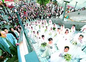 '내 웨딩드레스 어때요?' 일본 도쿄의 한 빌딩에서 6일 열린 '웨딩 드레스 경연대회'에서 아름답게 차려 입은 모델들이 관람객들을 맞았다.