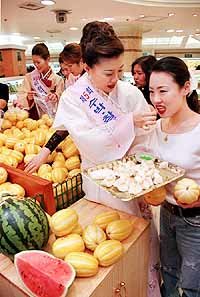 '성주참외 아가씨'가 직접 먹여주는 꿀참외. 신세계백화점은 14일까지 경북 성주에서 생산되는 참외 수박 멜론 등을 판매한다. <안철민기자>
