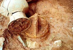 발굴된 유물 중에는 화장한 뒤 유골을 넣는 토기인 30㎝ 높이의 대형 ‘골호(骨壺)’와 삼국시대의 것으로 추정되는 철제 십자형 모자 장식물도 있다.